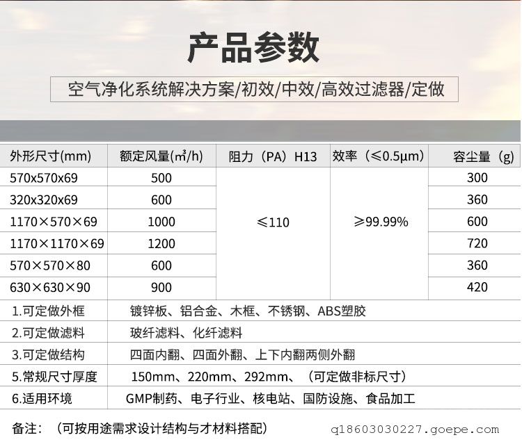 3、滤料选择:容尘量高的玻纤滤料、阻力低容尘量较好的PTFE滤料。