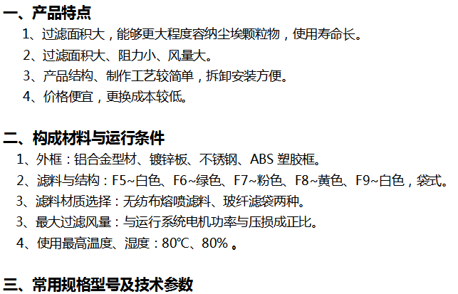 产品介绍:中效袋式过滤器主要用于过滤空气中1-5μm以上的尘埃颗粒物,适用于中央空调系统、洁净空调系统的中级空气过滤,主要用来保护高效过滤器,延长高效过滤器使用寿命,降低高效过滤器更换成本。关于中效袋式过滤器不可水洗说明:中效过滤器无纺布成分中含熔喷静电吸附滤料,与新冠肺炎口罩相同,不可水洗;若水洗熔喷遇水静电吸附尘埃颗粒物性能消失,导致过滤器过滤功能急剧下降,那么原来由中效拦截的尘埃颗粒物就会进入高效过滤器,严重影响高效过滤器的使用寿命,导致高效过滤器更换频率加快,甚至会影响洁净车间的整体洁净度。