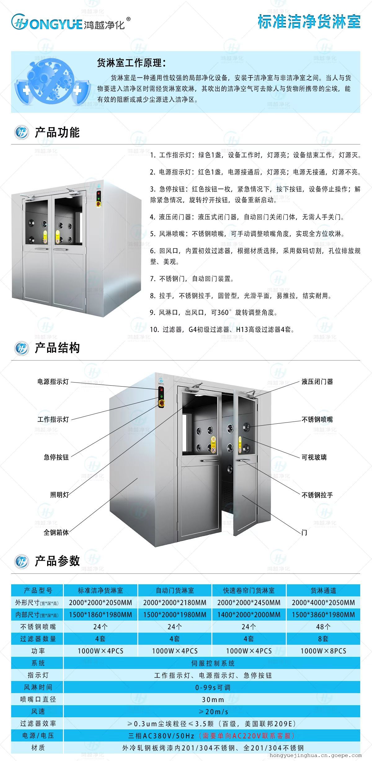 详细信息| 询价留言加工定制:是 吹淋方式:多人双吹 箱体材质:外钢板内不锈钢 适用对象:货淋室 功能:智能语言风淋室;快速卷帘门风淋室;自动门风淋室;手动门风淋室;防爆风淋室 品牌:鸿越 喷嘴数:12 自动化程度:全自动 型号:HY-HLS03 喷嘴口直径:25 mm 过滤器效率:99.99% 喷口风速:0.85 m/s 循环风量:2000 风淋区尺寸:2000*2000*2050MM 风淋时间范围:0-100秒可调 电源:380 v 最大功率:1 kw 适用领域:无尘车间 -