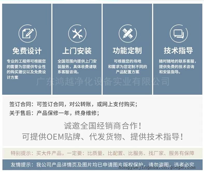广东鸿越净化设备实业有限公司,是一家*研发,公司主要产品有三大系列:净化设备系列--风淋室、货淋室、自动风/货淋室、PVC快速卷帘门风/货淋室、标准传递窗、风淋传递窗、洁净工作台、FFU送风单元、各种级别洁净棚、各种规格高效送风口等等;医药净化设备系列--层流风淋传递窗、各种规格液槽高效送风口、生物洁净工作台、洁净层流罩、FFU层流罩、负压称量室、生物洁净传递窗、隔离器系统、洁净层流车;及非标自动化改善设备;配套生产净化末端设备耗材:初/中/高效空气过滤器、滤芯;为客户提供多元化的区域净化解决方案。各种铁板、不锈钢、冲孔、平板、五金制品加工的经营范围极其广泛的工业园形式的实业公司。十足实力,质量可靠,服务周到,公司秉承“顾客至上,锐意进取”的经营理念,坚持“价格*低,品质*好”的原则为广大客户提供优质的服务。