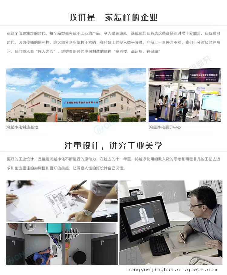 广东鸿越净化设备实业有限公司,是一家*研发,公司主要产品有三大系列:净化设备系列--风淋室、货淋室、自动风/货淋室、PVC快速卷帘门风/货淋室、标准传递窗、风淋传递窗、洁净工作台、FFU送风单元、各种级别洁净棚、各种规格高效送风口等等;医药净化设备系列--层流风淋传递窗、各种规格液槽高效送风口、生物洁净工作台、洁净层流罩、FFU层流罩、负压称量室、生物洁净传递窗、隔离器系统、洁净层流车;及非标自动化改善设备;配套生产净化末端设备耗材:初/中/高效空气过滤器、滤芯;为客户提供多元化的区域净化解决方案。各种铁板、不锈钢、冲孔、平板、五金制品加工的经营范围极其广泛的工业园形式的实业公司。十足实力,质量可靠,服务周到,公司秉承“顾客至上,锐意进取”的经营理念,坚持“价格*低,品质*好”的原则为广大客户提供优质的服务。